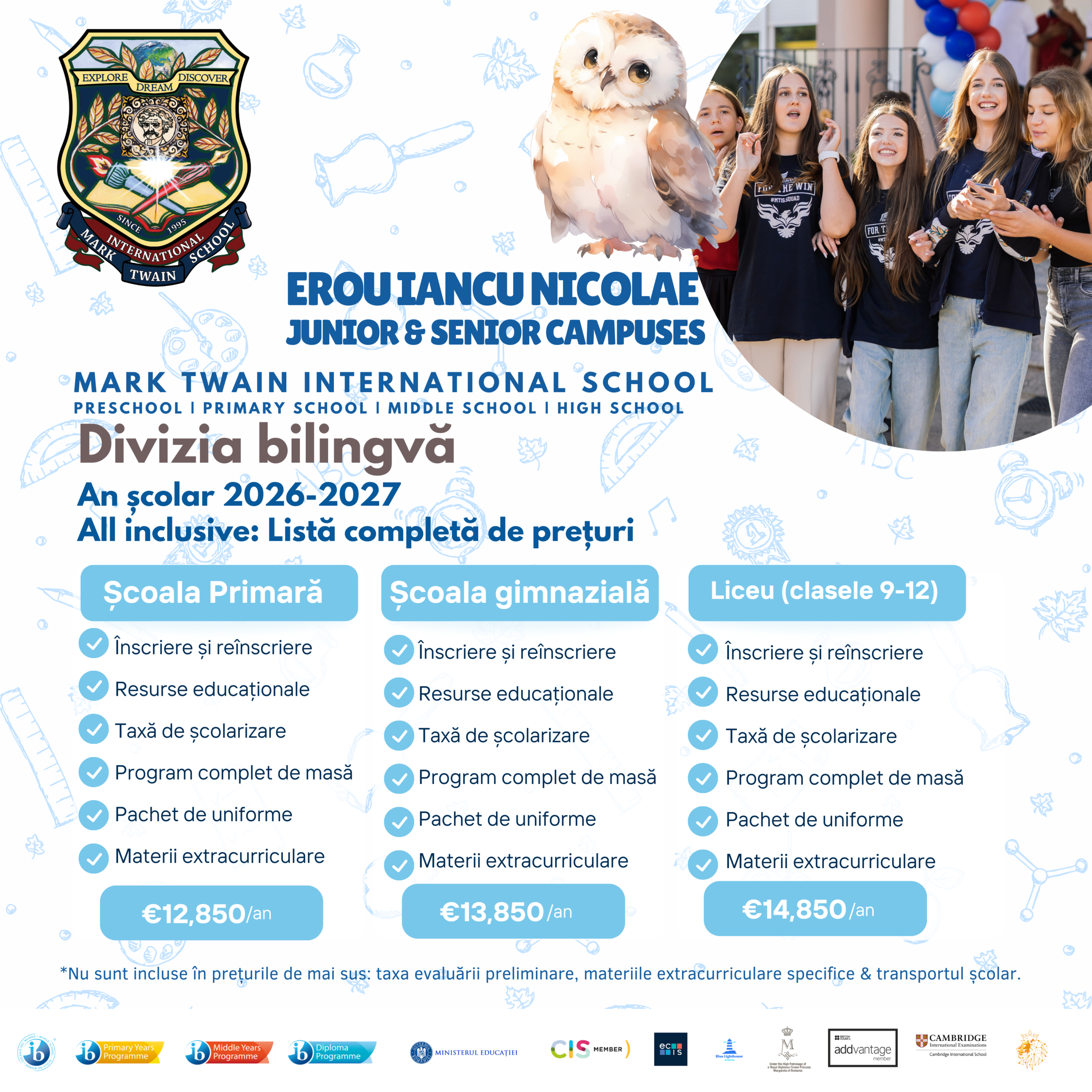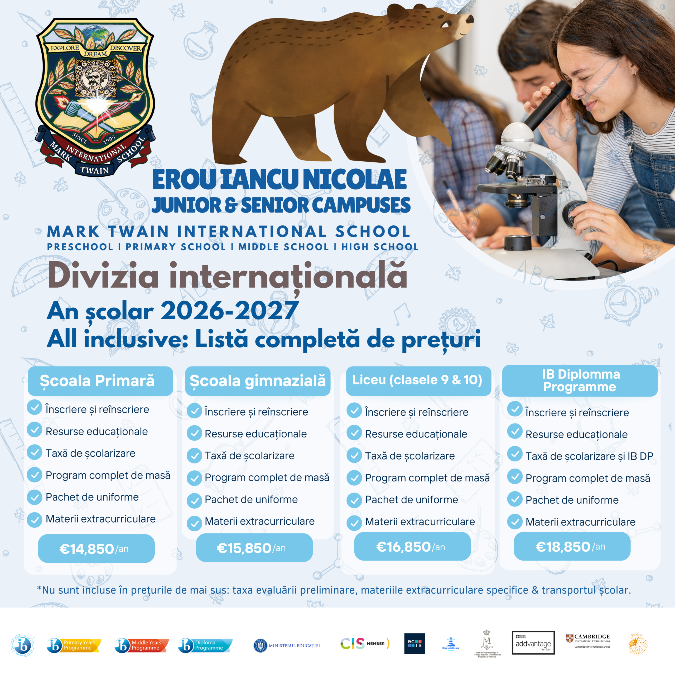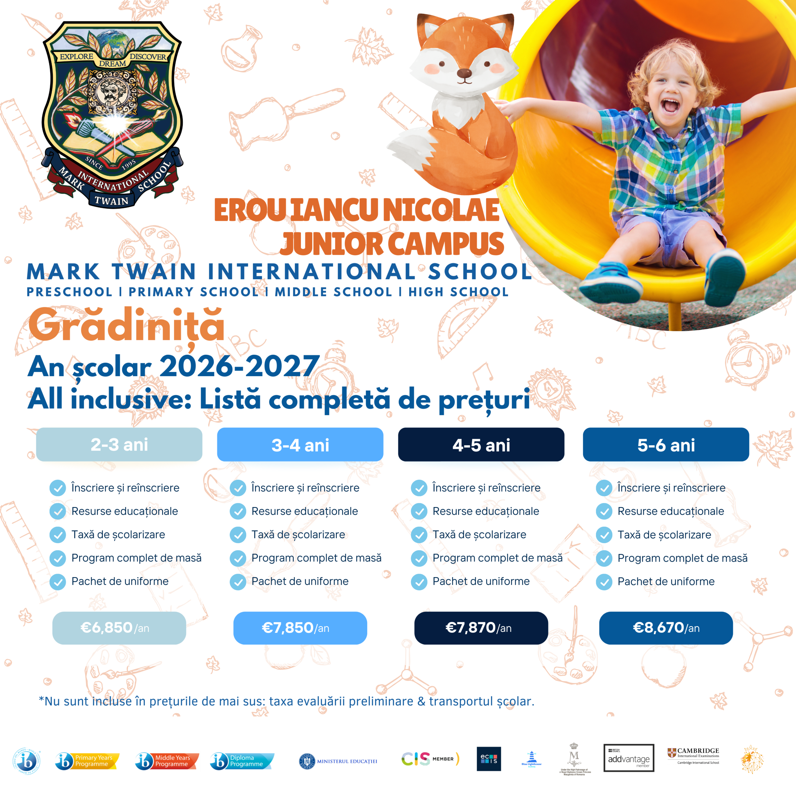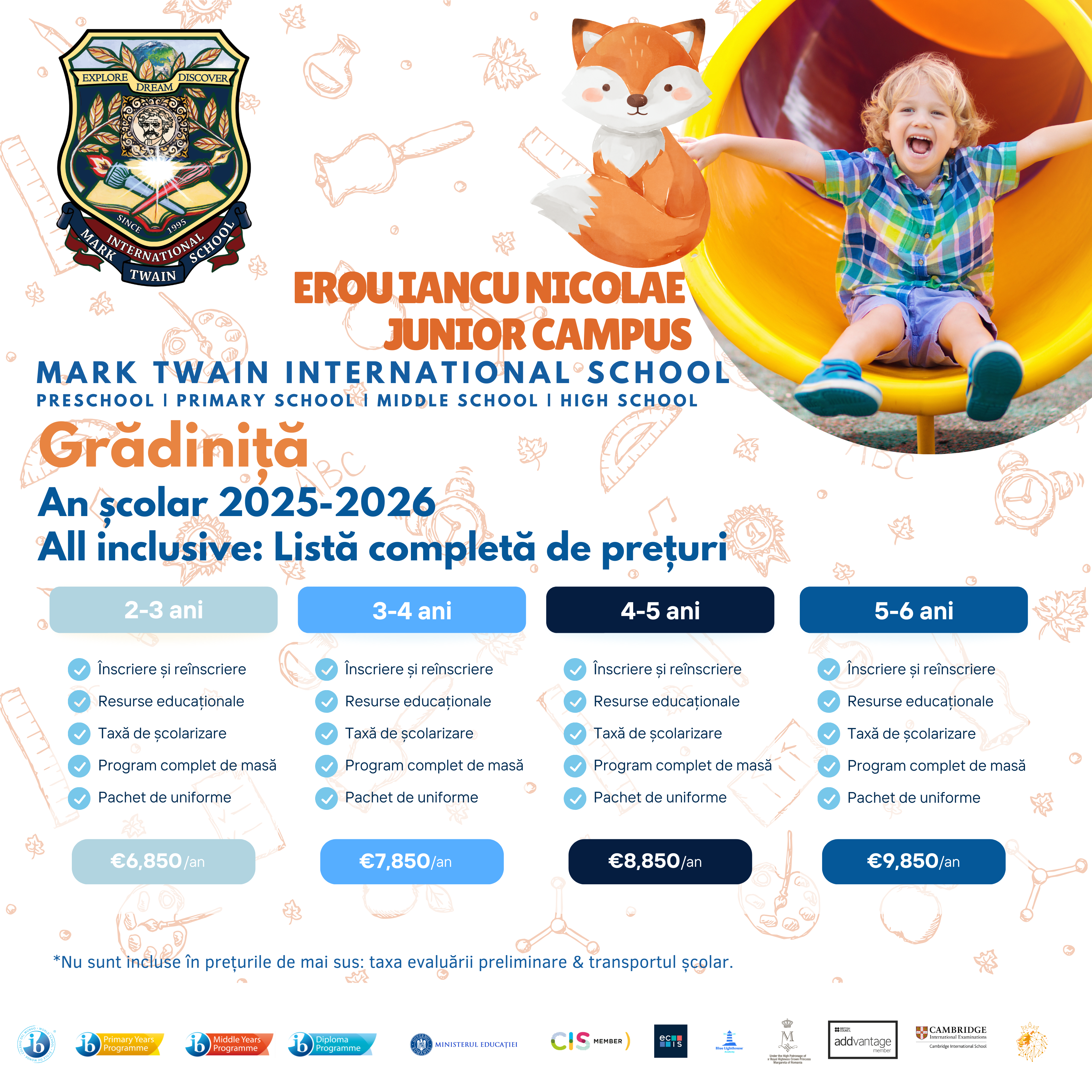 Procesul nostru de înscriere implică două acorduri separate: un contract de școlarizare, care se achită în două tranșe, și un contract pentru serviciile școlare, care trebuie plătit integral în momentul înregistrării.