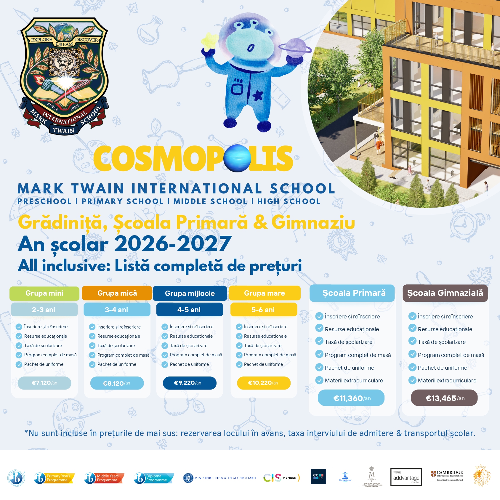 Vizitează Campusul Mark Twain Cosmopolis pentru a descoperi cum creăm o galaxie de oportunități pentru elevi. Aici, învățarea nu are granițe, iar fiecare copil este o stea pregătită să strălucească.